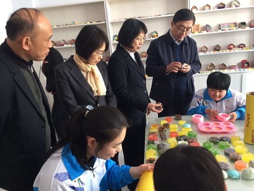 (图为省残联黄庆峰副理事长在夏津特殊教育学校观看残疾儿童制作肥皂)