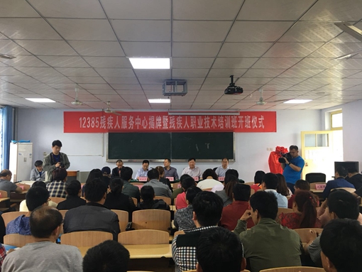 禹城市残联在德州科技职业学院举办12385残疾人呼叫中心揭牌暨残疾人职业技术培训班开班仪式。禹城市政府党组成员吴洪生、德州科技职业学院院长朱吉辉、禹城市残联理事长陈法勇、各乡镇(街道)残联理事长、残疾人专职干事及60名参加培训的残疾人参加了此次活动。